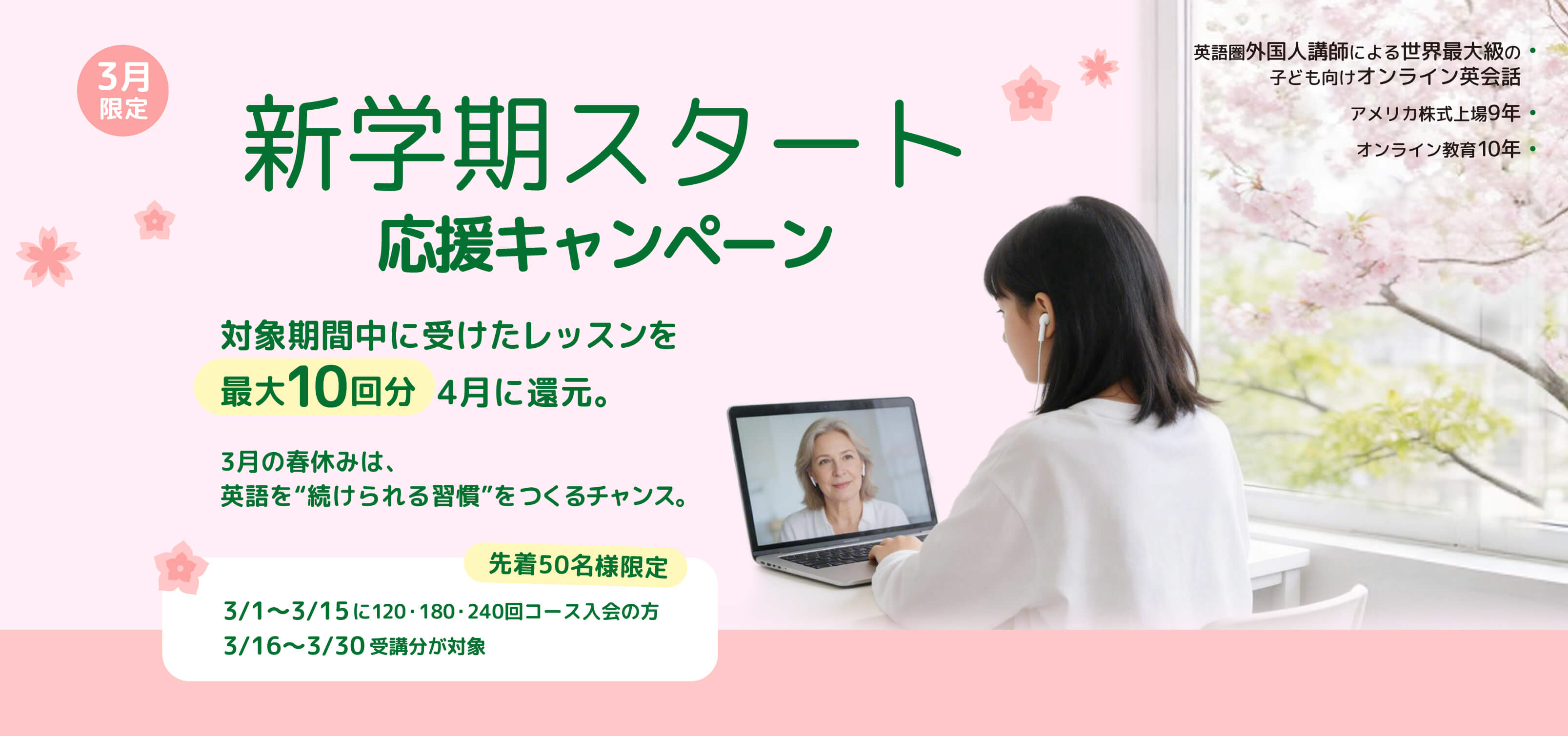 現在51talkでは、新学期スタート応援キャペーンを実施中です。4月1日~15日までの期間限定キャンペーンとなっており、通常のレッスンポイントに加えレッスンポイントがボーナスとして付与されます。