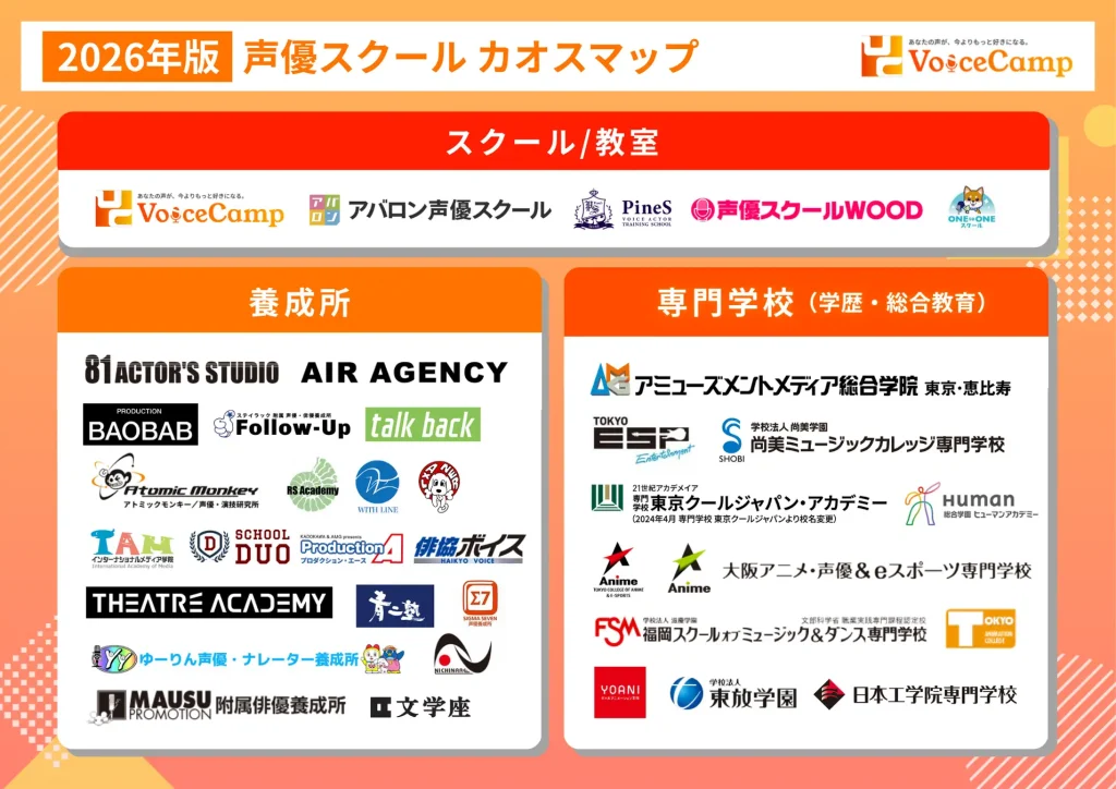 【Voice Camp(ボイスキャンプ)】声優スクール業界の全体像がわかる「声優スクールカオスマップ2026」を公開