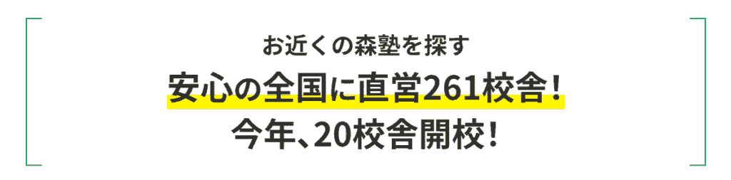 森塾は、関東地方を中心に全国展開している大手個別指導塾です。先生1人につき生徒2人までの丁寧な指導で、「やればできる!」という自信を育てる教育方針が多くの保護者やお子さんに支持されています。他にも全国に直営校舎が261校舎もある点も指示されている理由の一つです。