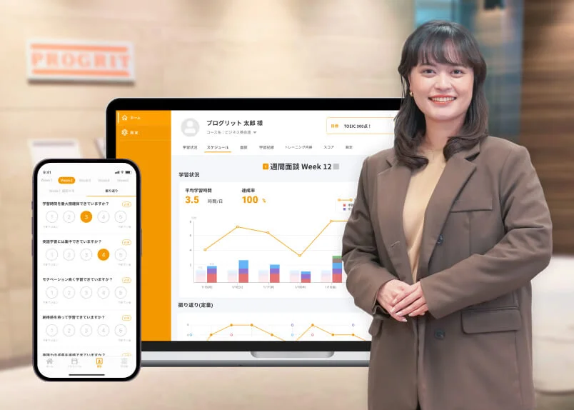 プログリットは、短期間で英語力を高めたい人に向けたコーチング型の英語学習サービス。通学不要でスマホや専用アプリを使って日々の学習管理や進捗確認ができるため、忙しい社会人でもスキマ時間を活用しながら続けやすいのが特徴です。
