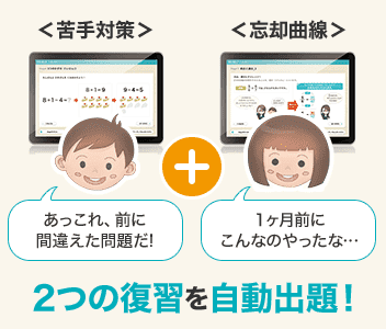 RISU算数は先取り学習のみならず、復習にも力を入れているのがポイントです。忘却曲線に基づいて自動で間違えた問題を復習出題するので、繰り返し学習で苦手な箇所も定着しやすくなります。