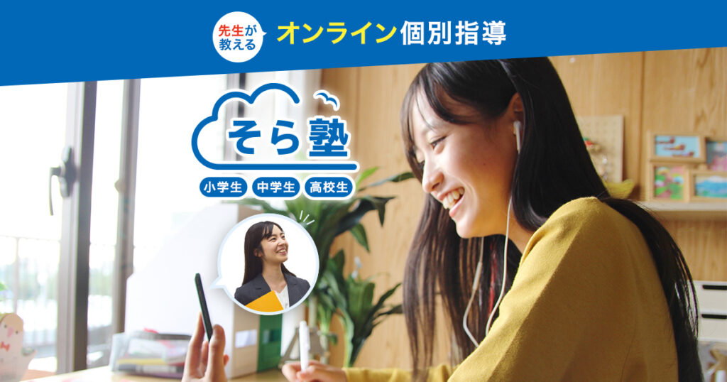 そら塾は自宅にいながら本格的な個別指導を受けられるオンライン塾です。定期テスト対策や受験指導だけでなく、自習室や講師サポートなど日々の学習習慣づくりにも力を入れています。