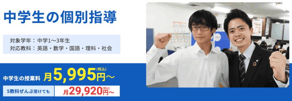 | 中学1年生~2年生 | 週1コマ 5,995円 週2コマ 11,990円 週3コマ 17,985円 週4コマ 23,980円 週5コマ 29,975円 |